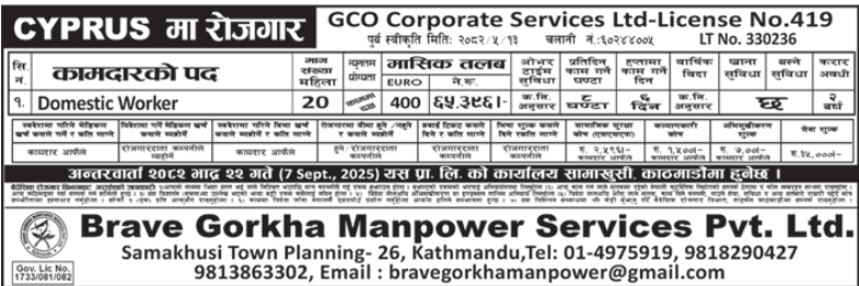 Navigating the landscape of overseas jobs requires a trusted and insightful source of information, especially for women seeking roles abroad. This is where the role of a dedicated and conscientious aggregator becomes absolutely vital. By meticulously curating opportunities from accredited recruiters, a service like ShramSansar acts as a critical bridge, connecting skilled and diligent Nepali women with esteemed international employers like GCO Corporate Services Ltd. It empowers applicants by providing transparent access to all crucial details from the competitive salary and clear break-down of minimal costs to the recruiter’s credentials allowing for informed and confident decision-making. Discovering a listing of this quality on the ShramSansar platform should give any potential applicant significant confidence in its legitimacy and terms. For ambitious women looking to build a stable and prosperous career in Europe, this role in Cyprus is an outstanding opportunity. As a final note to all prospective applicants who find this through ShramSansar, it is essential to act with due diligence and promptness. Interested and eligible candidates must submit their applications through the designated agency, Brave Gorkha Manpower, well before the final deadline on September 7th, 2025. This represents more than just a job; it is a secure, pre-vetted pathway to financial independence and international experience, highlighted by the trusted and reliable network that ShramSansar provides to the Nepali workforce.
